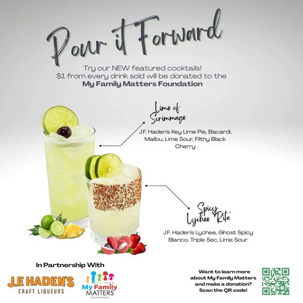 At Buffalo Wild Wings of South Florida, Pour It Forward is our year-round commitment to giving back through the spirit of hospitality. For every featured cocktail you enjoy, we donate $1 to a local charity creating meaningful impact in our community. It’s a simple idea with powerful results: great drinks that help fund great work. By choosing Pour It Forward, you’re supporting programs that uplift families, empower youth, and strengthen the neighborhoods we proudly serve.
